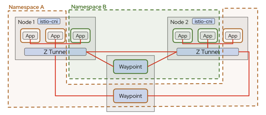 Because it operates at Layer 4, ztunnel is lightweight and reduces per-pod resource overhead, while still providing zero-trust security and basic observability. For Layer 7 features like HTTP routing, retries, or authorization, waypoint proxies are deployed on top of ztunnel.