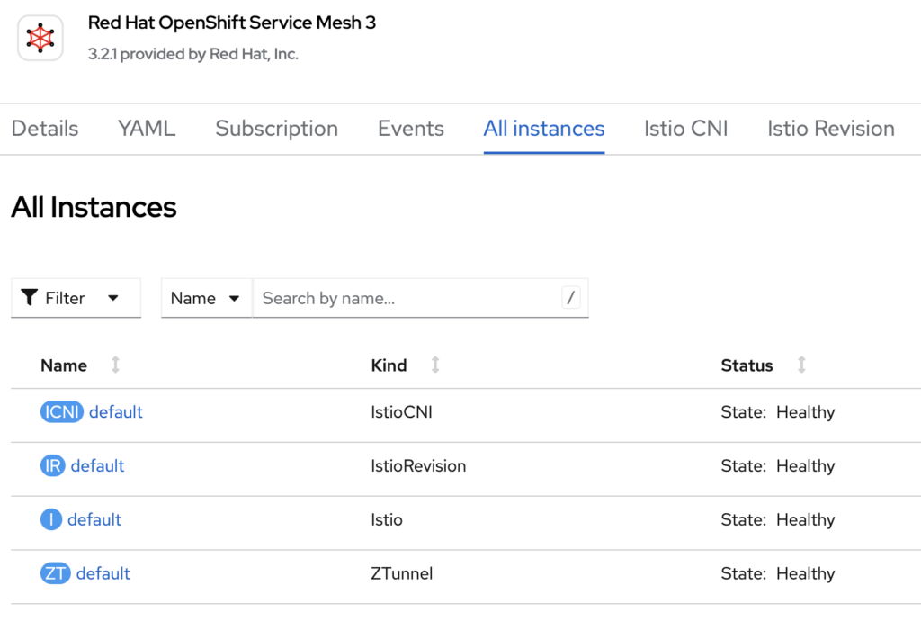 Once you have deployed Istio, IstioCNI, and Ztunnel, you will see the status of those from OpenShift Service Mesh 3 operator page: