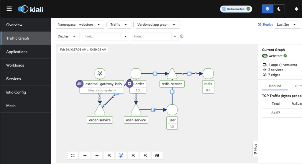 - Layer 4 Metrics – Kiali can visualize traffic between workloads through ztunnel, including connection counts, throughput, and mTLS status.