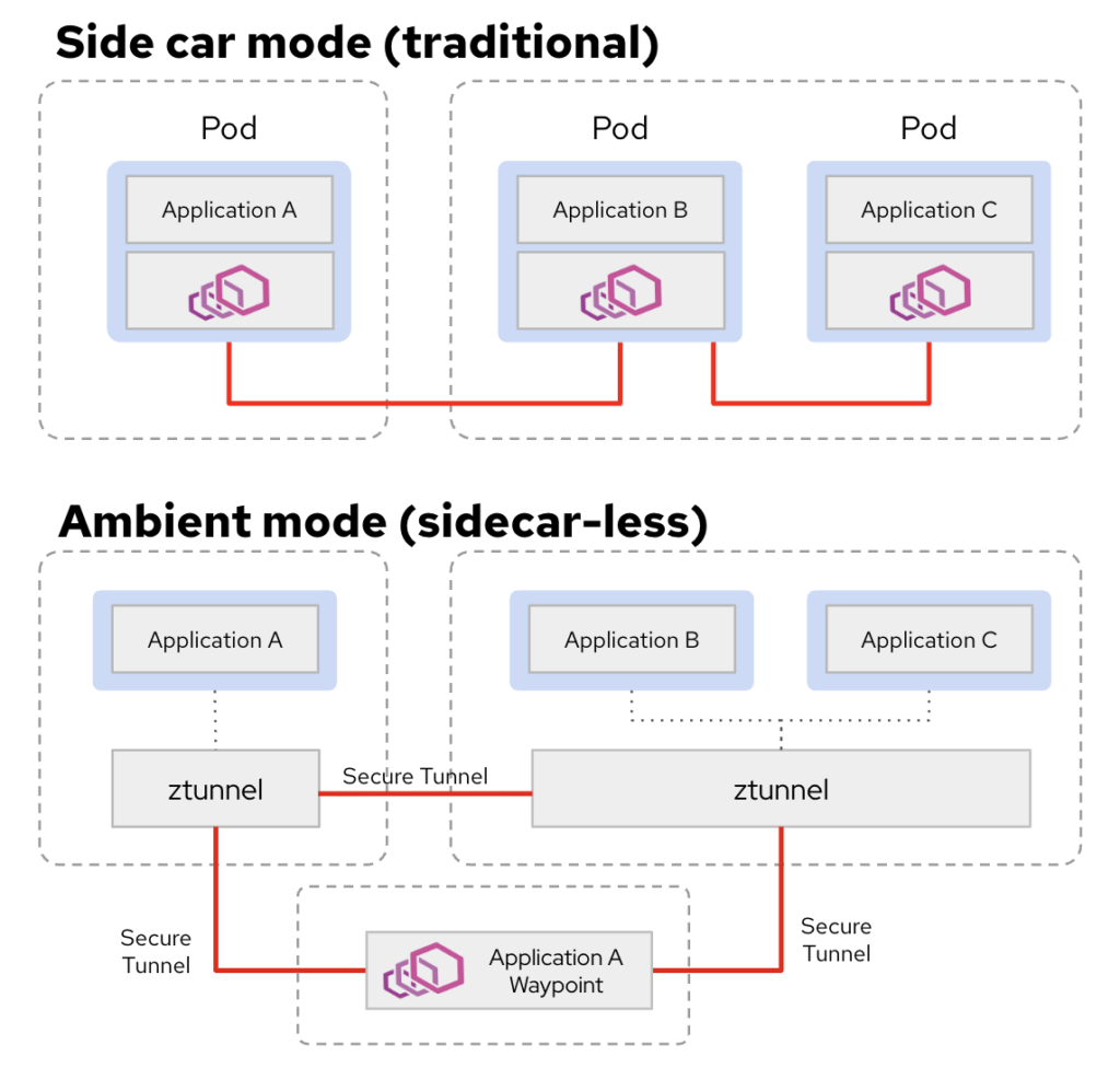 Ambient Mode represents a fundamental shift in how mesh services are delivered, moving away from the “sidecar-per-pod” model. Unlike the traditional approach, which requires an Envoy proxy to be injected into every application pod, Ambient Mode decouples the data plane from the application lifecycle. This eliminates the need for container restarts during mesh updates and reduces the resource footprint of your cluster.
