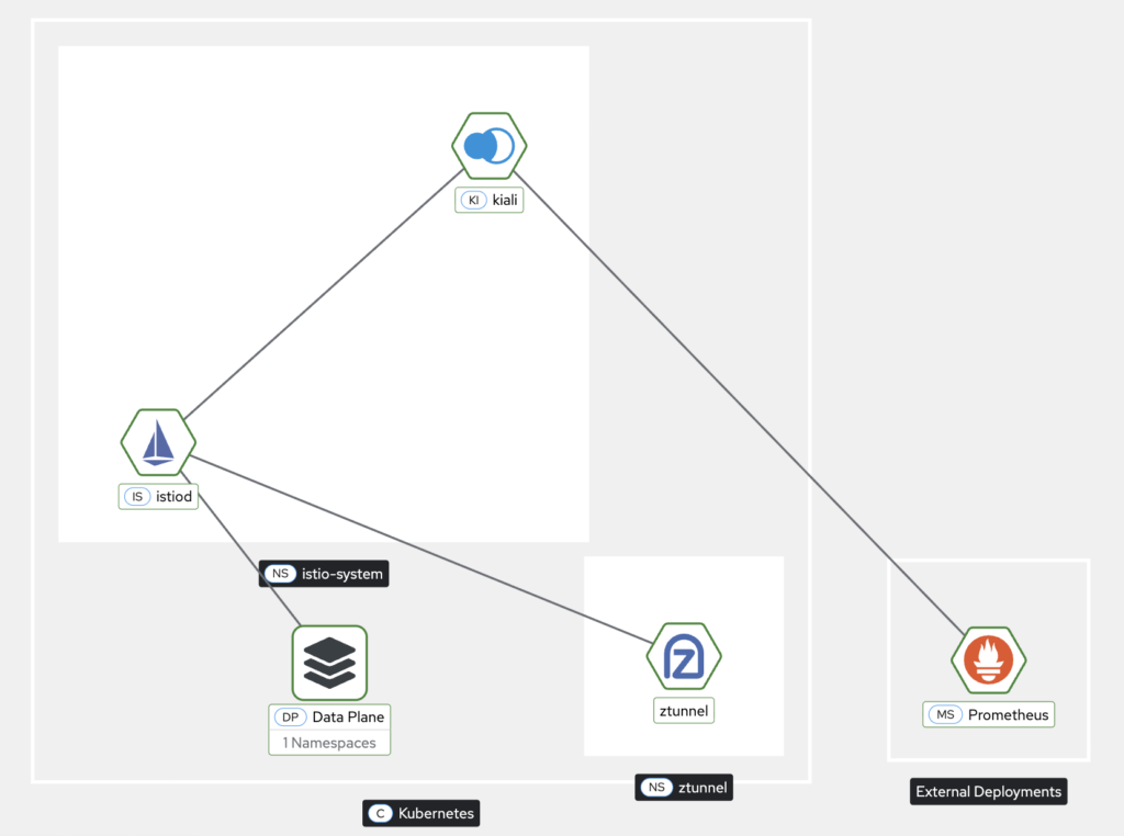 - Integration with Prometheus – Kiali relies on Prometheus to collect metrics, which are scraped from ztunnel pods (via PodMonitor) and waypoint proxies (via ServiceMonitor).